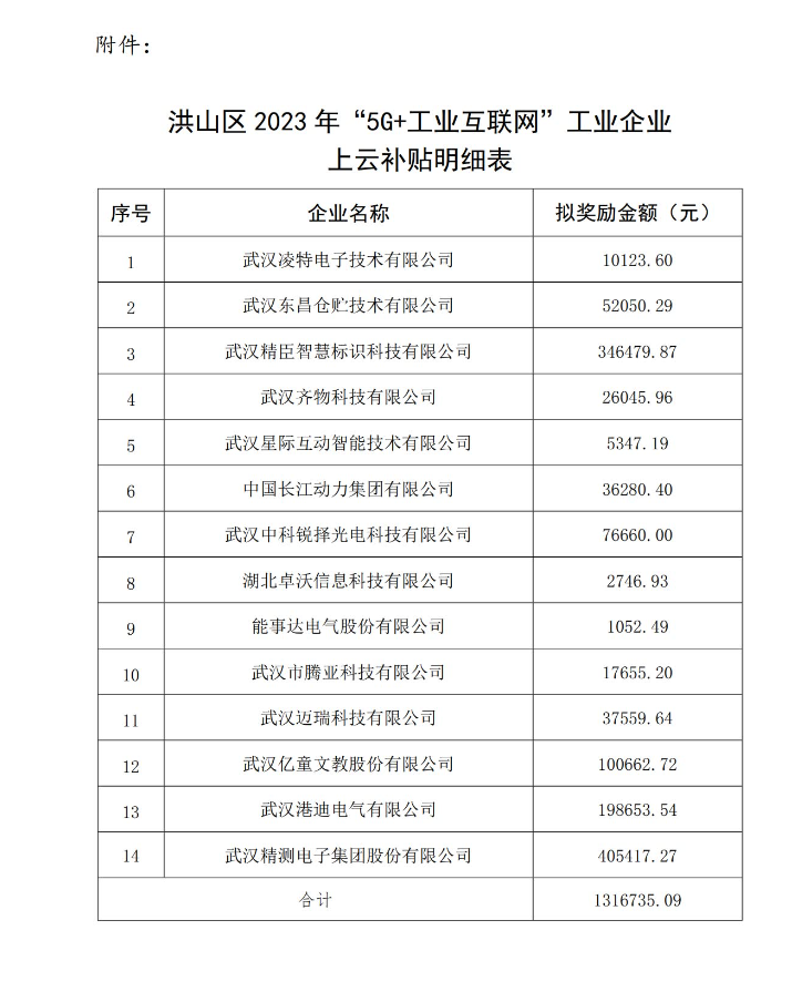 附件:洪山區(qū)2023年“5G+工業(yè)互聯網”工業(yè)企業(yè)上云補貼明細表